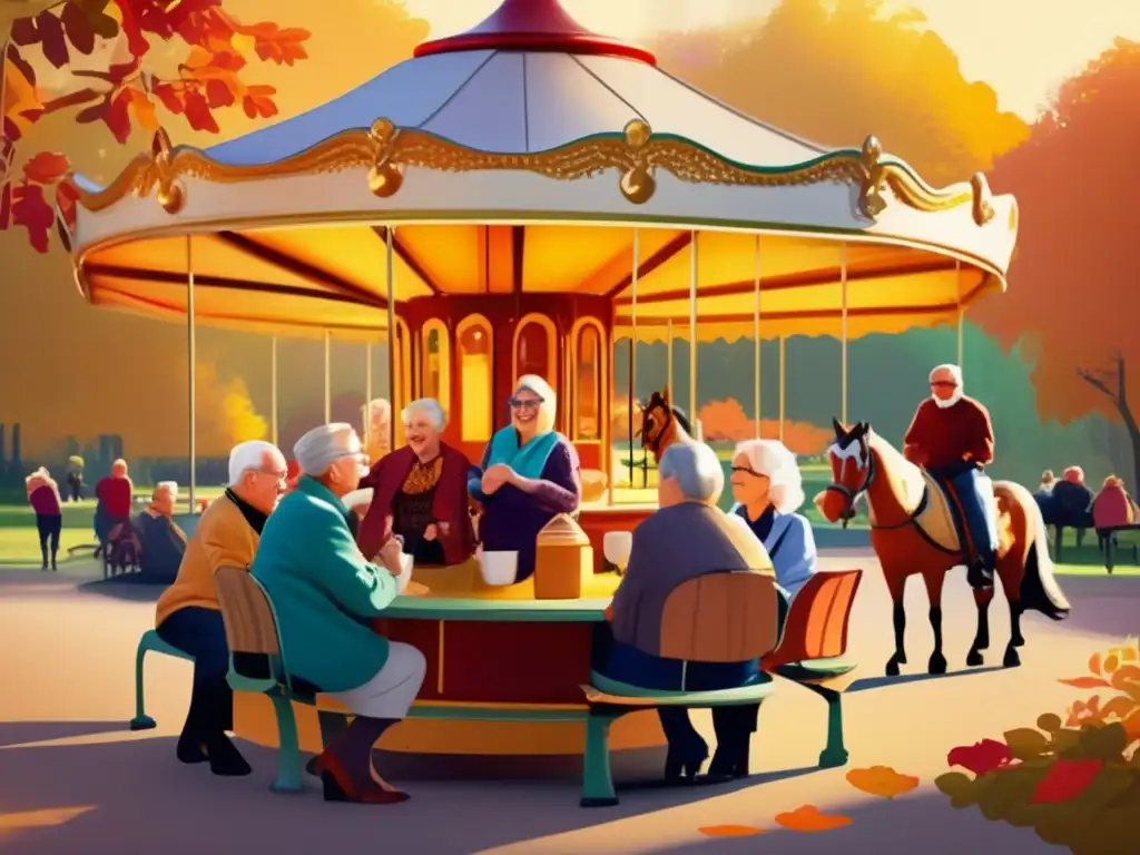 Beneficios del humor en la jubilación: Retirados disfrutando de la compañía y la alegría en un parque soleado